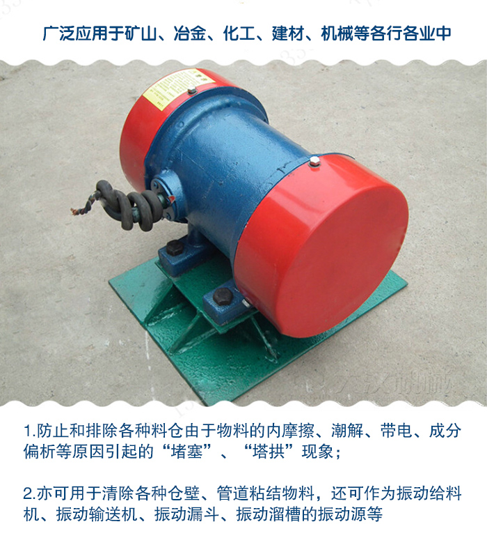 防止和排除各種料倉由于物料的內摩擦、潮解、帶電、成分偏析等原因引起的“堵塞”、“塔拱”現象;亦可用于清除各種倉壁、管道粘結物料,還可作為振動給料機、振動輸送機、振動漏斗、振動溜槽的振動源等。廣泛應用于礦山、冶金、化工、建材、機械等各行各業中。